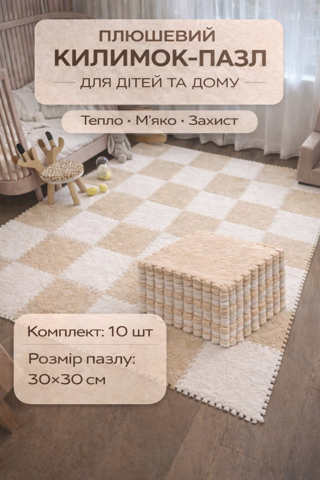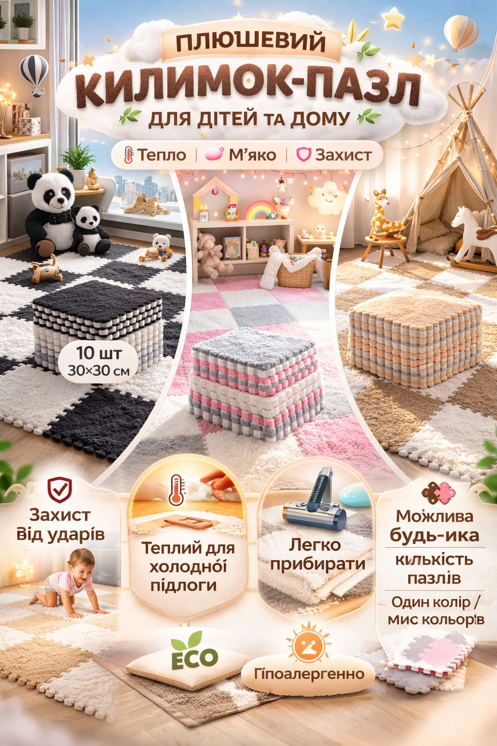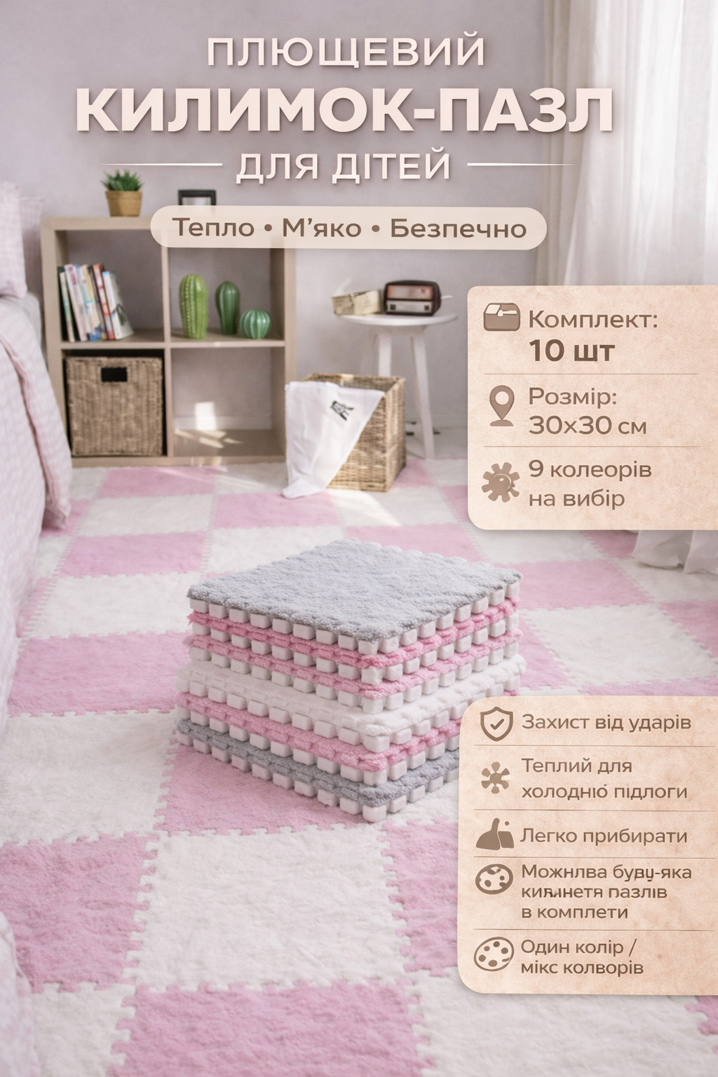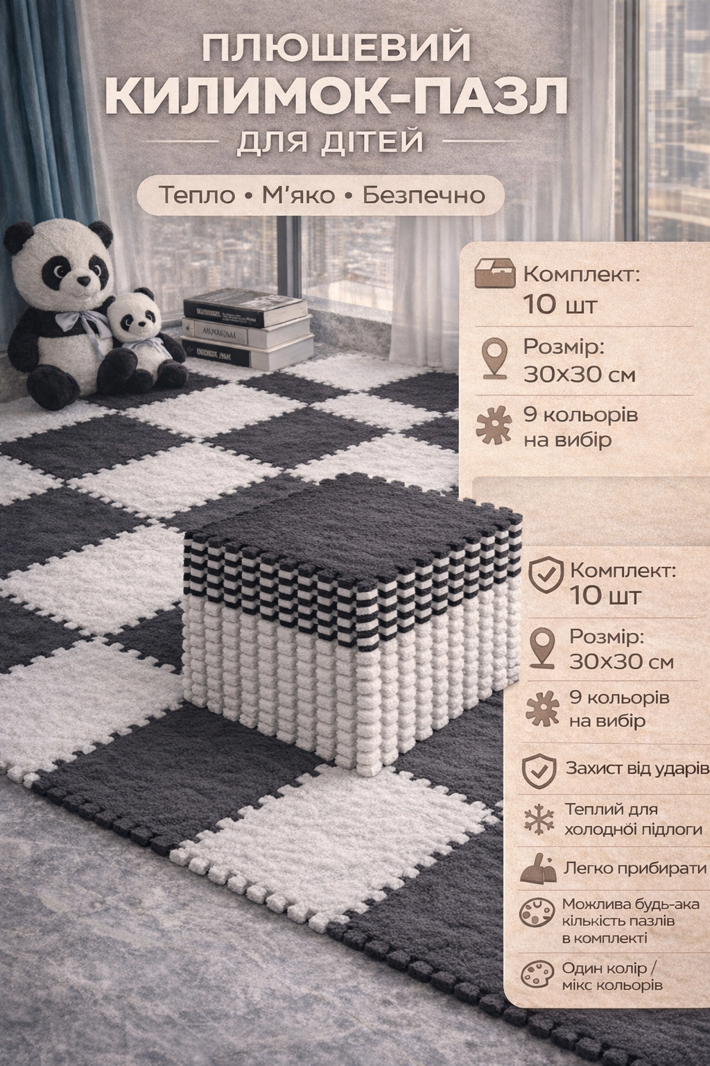 Плюшевий килимок-пазл створює м’яку та затишну поверхню для ігор і відпочинку. Добре утримує тепло та захищає від холодної підлоги, забезпечуючи комфорт у будь-яку пору року.