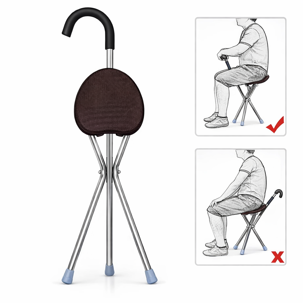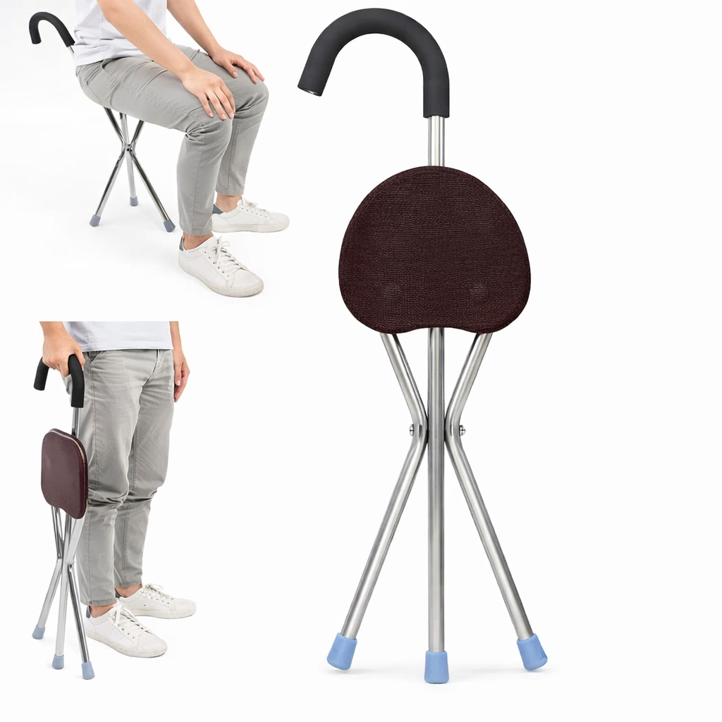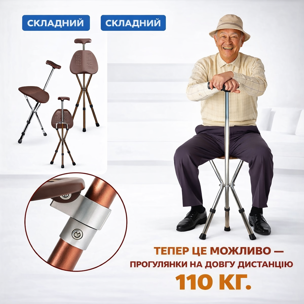 Складана тростина-стілець поєднує функції опори та зручного сидіння. Легко складається, не займає багато місця та зручно переноситься під час прогулянок або подорожей.